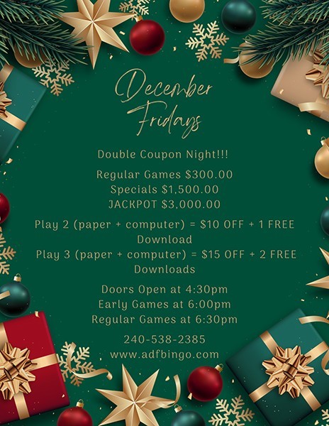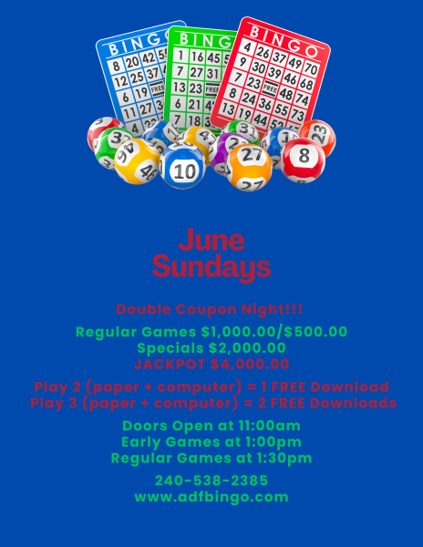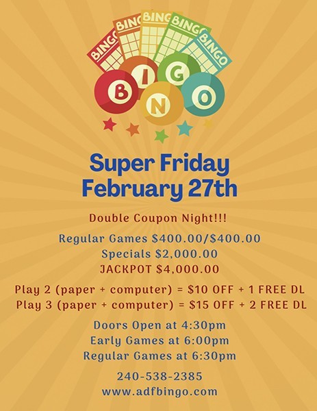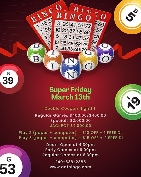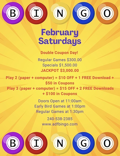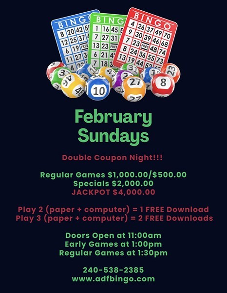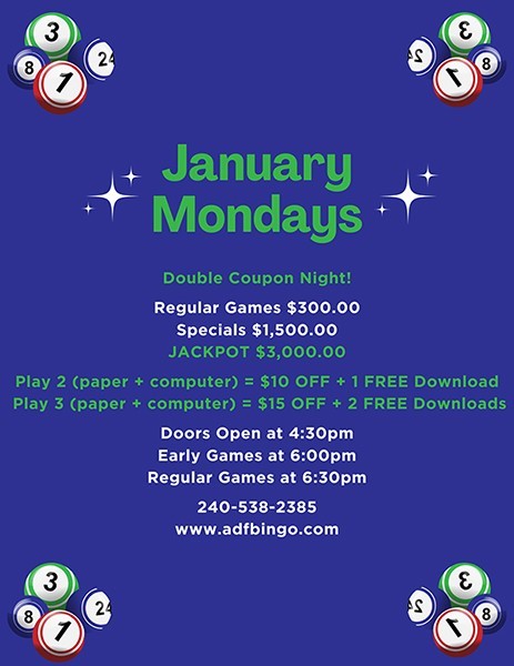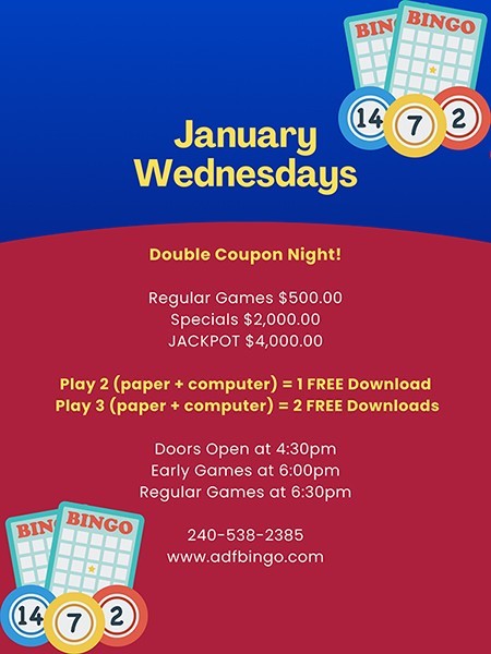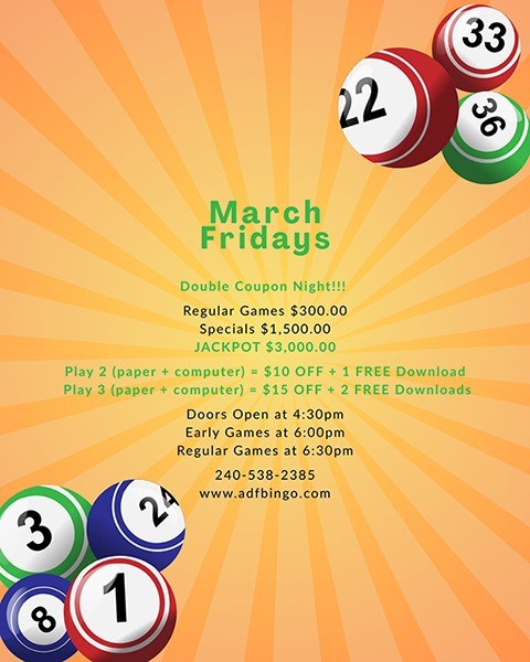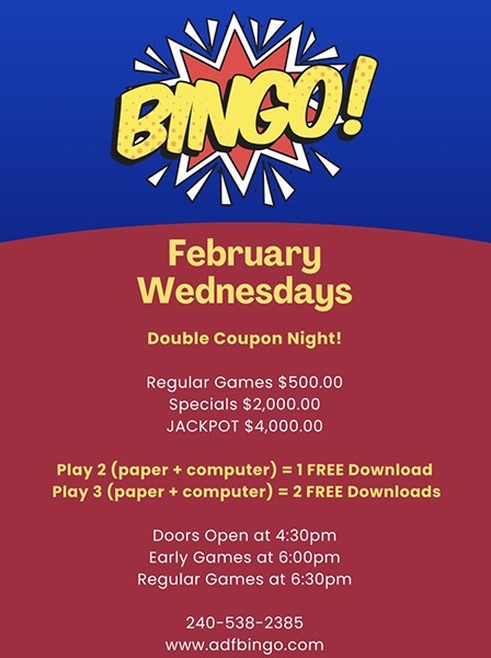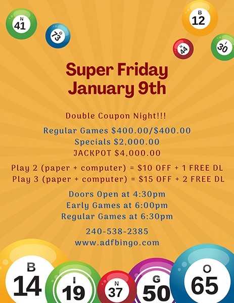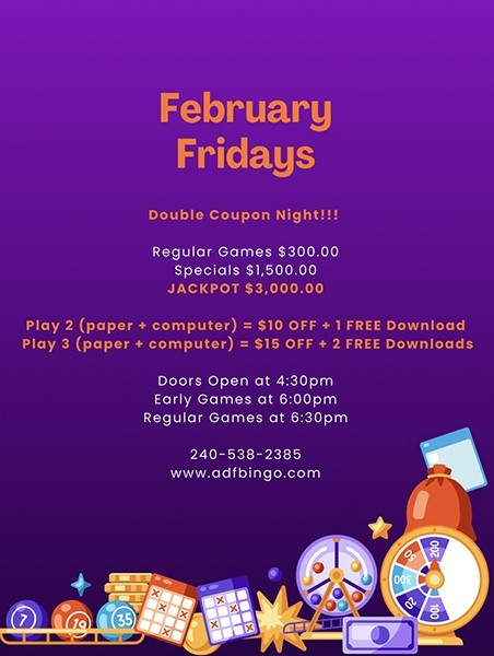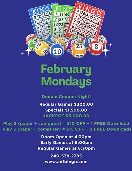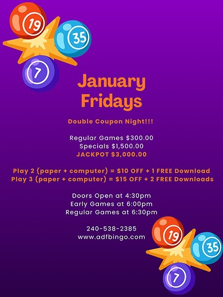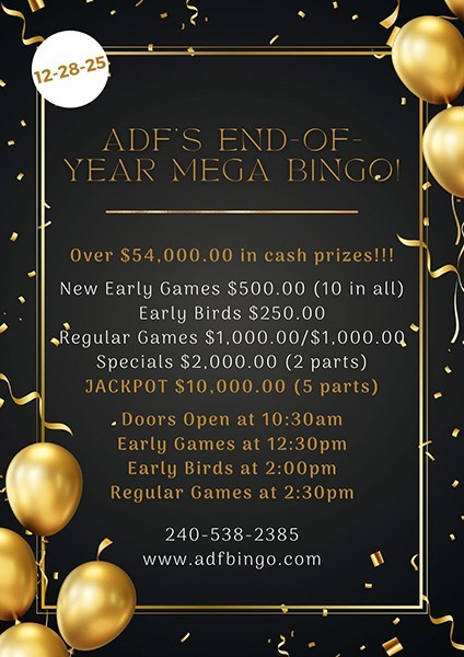 You’ll enjoy exclusive offers, promotions, discounts, and more! Get your ADF Bingo Loyalty Card today and start earning your rewards! The more you play the more points you receive!